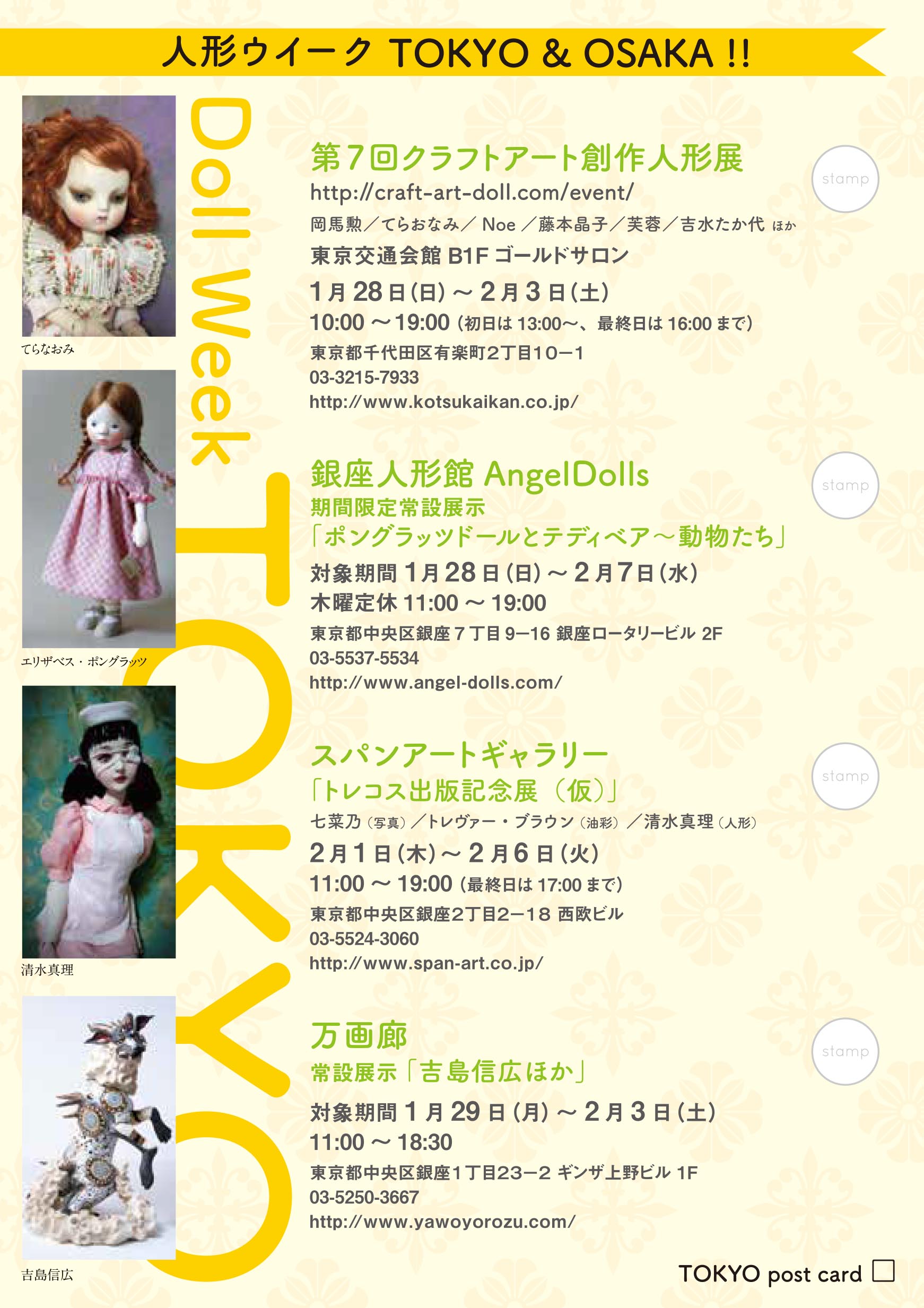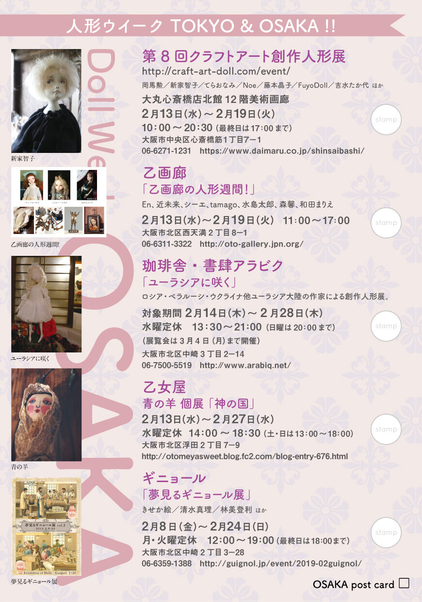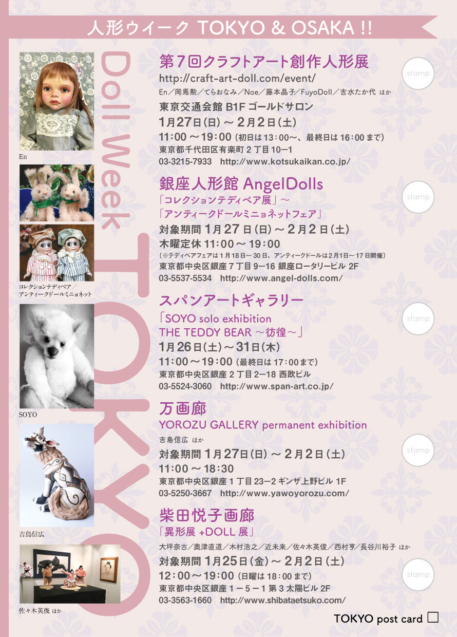 | 2018年1月~2月 | 人形ウイーク | 東京・東京交通会館、銀座人形館、スパンアートギャラリー、万画廊 大阪・心斎橋大丸、乙画廊、アラビク、乙女屋、ギニョール | ![]() ![]() | 人形コンクール展覧会時期にあわせて近隣の審査員ギャラリーと共同して人形ウイーク・スタンプラリーを実施した。地域全体で創作人形を盛り上げるねらい。東京は2019年、大阪は2023年まで継続した。 |