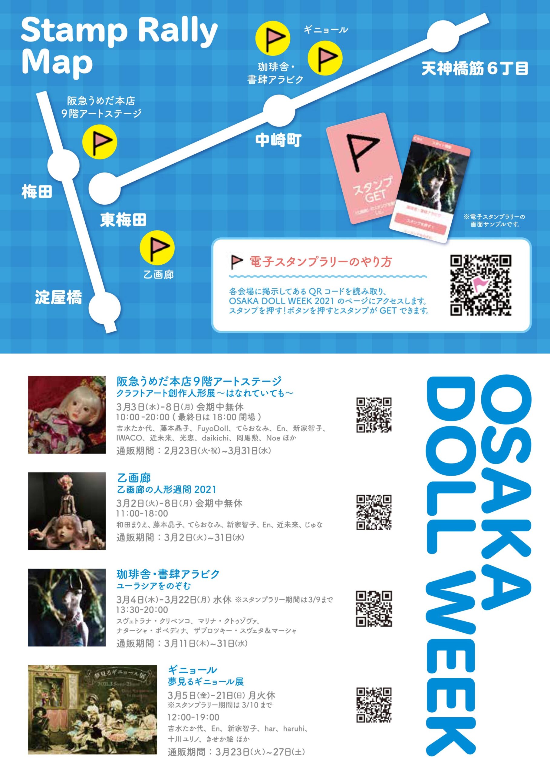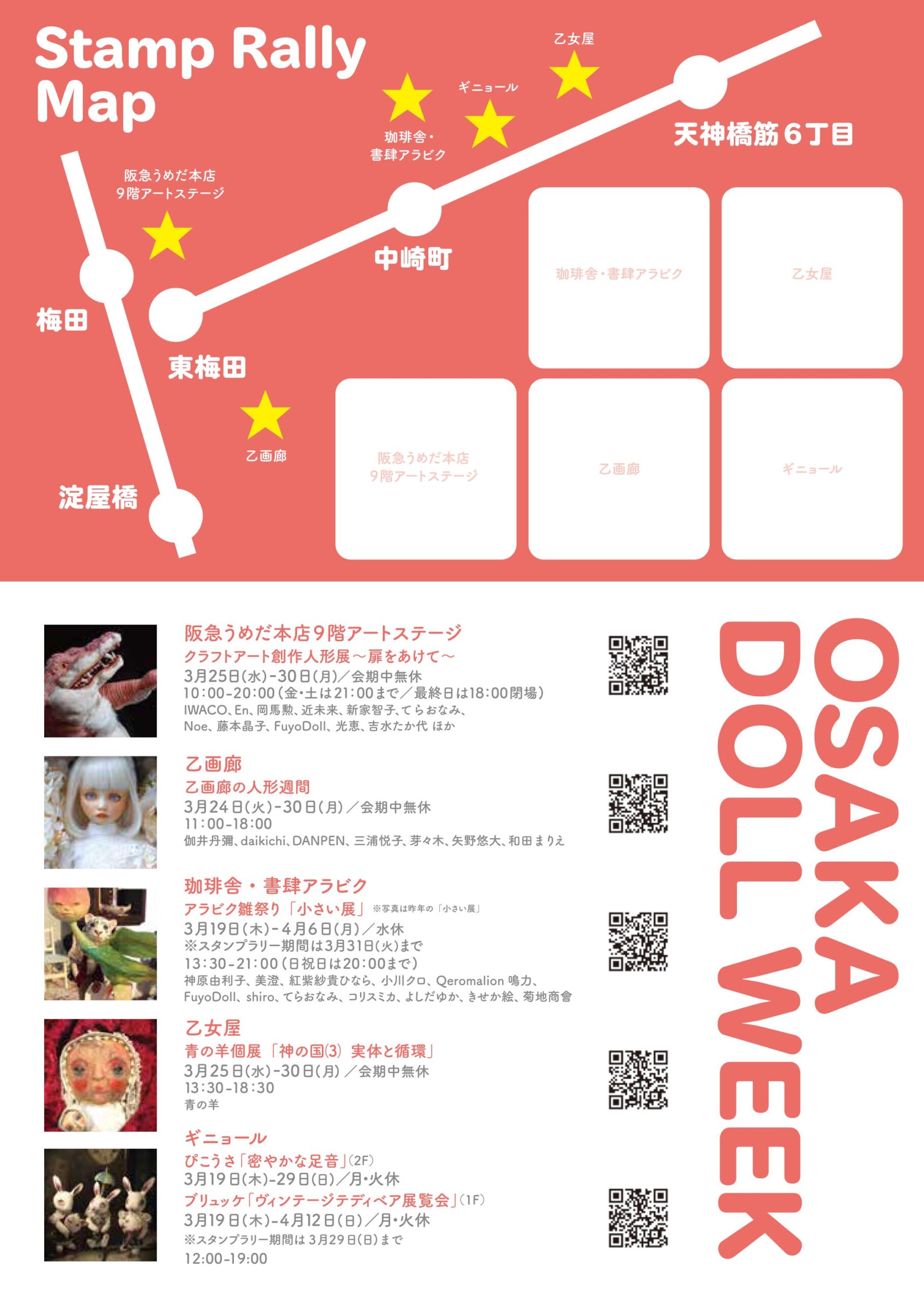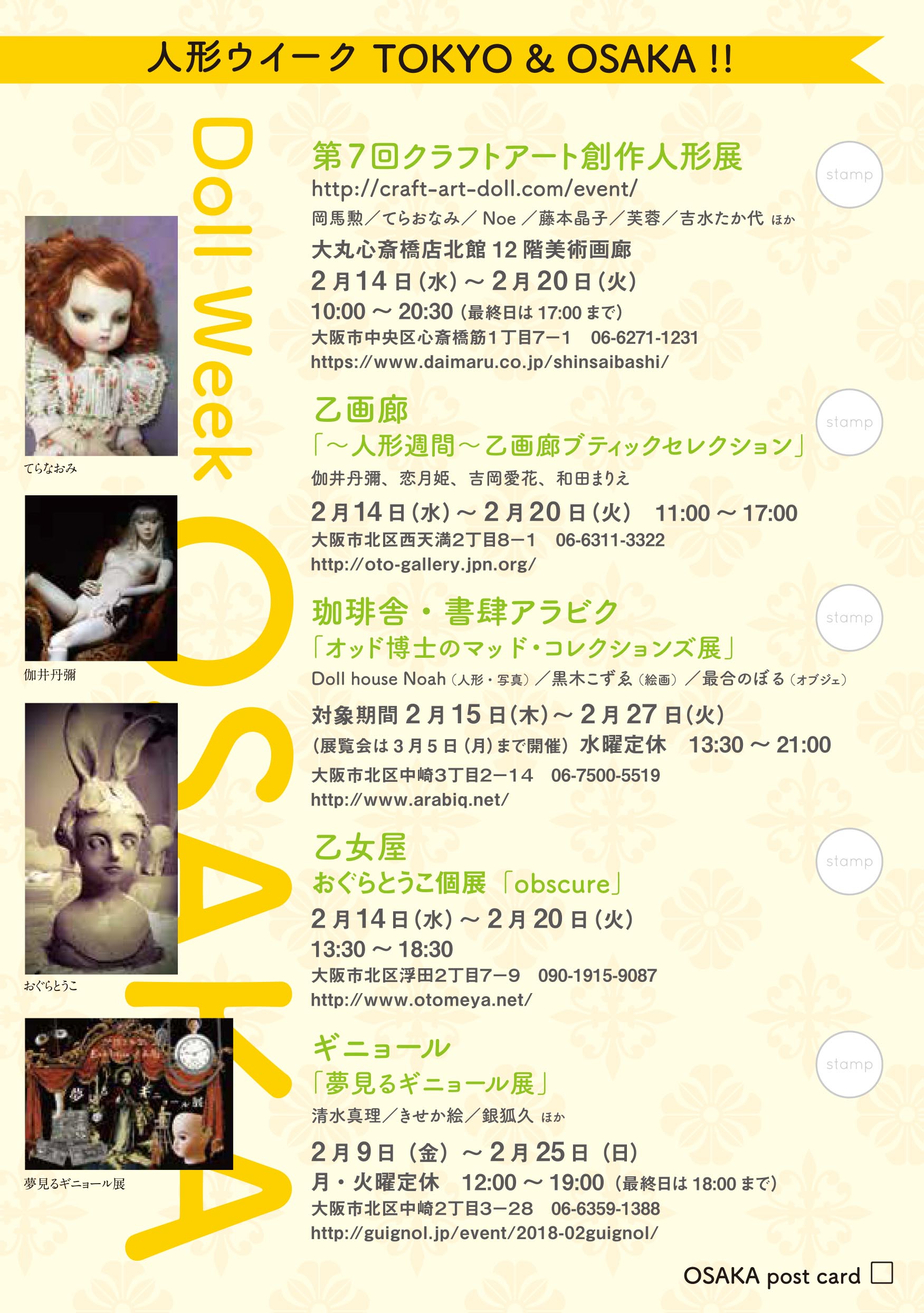 | 2018年1月~2月 | 人形ウイーク | 東京・東京交通会館、銀座人形館、スパンアートギャラリー、万画廊 大阪・心斎橋大丸、乙画廊、アラビク、乙女屋、ギニョール | ![]() ![]() | 人形コンクール展覧会時期にあわせて近隣の審査員ギャラリーと共同して人形ウイーク・スタンプラリーを実施した。地域全体で創作人形を盛り上げるねらい。東京は2019年、大阪は2023年まで継続した。 |