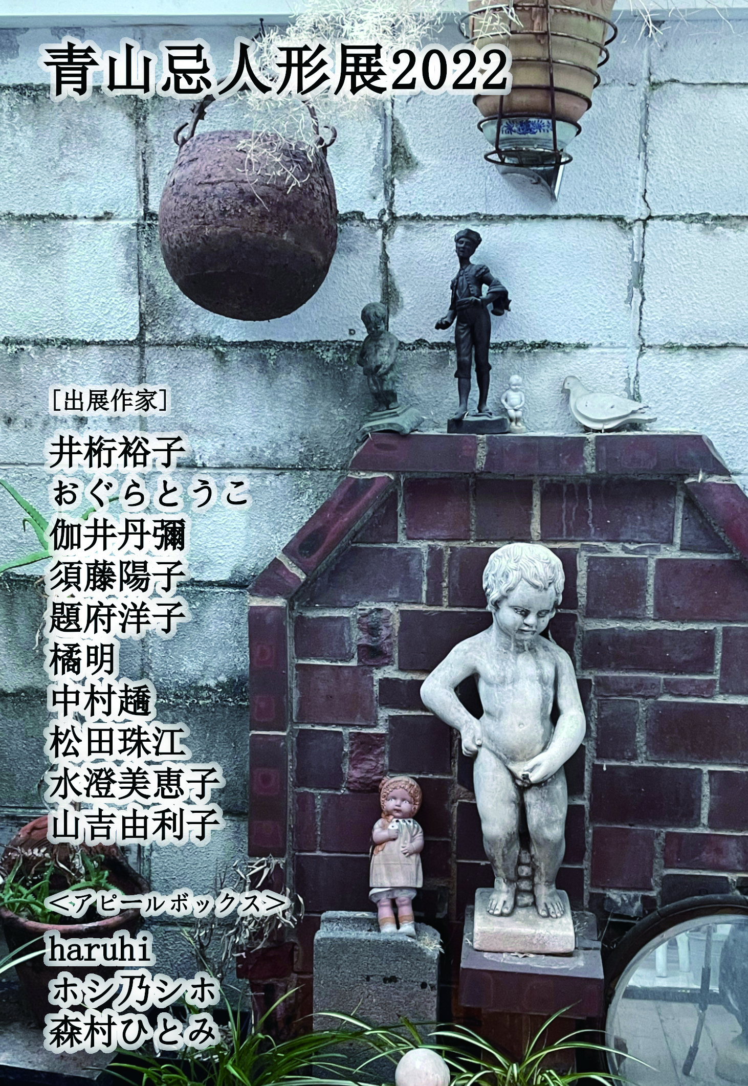 | 2022年9月2日~7日 | 青山忌人形展(主催:青山忌人形展実行委員会) | 京都・昔人形青山/K1ドヲル | ![]() | 青山氏が新人の展示機会として用いていた「アピールボックス」を再開。クラフトアート人形コンクールから、審査員の乙女屋・藤林美保氏が中心となって人選している。 |