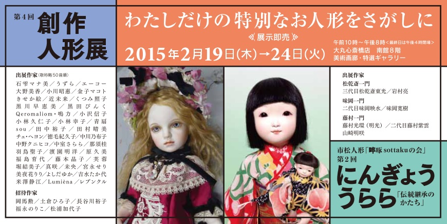 | 2015年2月19日~24日 | 第4回創作人形展(第2回クラフトアート人形コンクール)~わたしだけの特別なお人形をさがしに~ | 大阪・大丸心斎橋店 南館8階 美術画廊 | ![]() | |