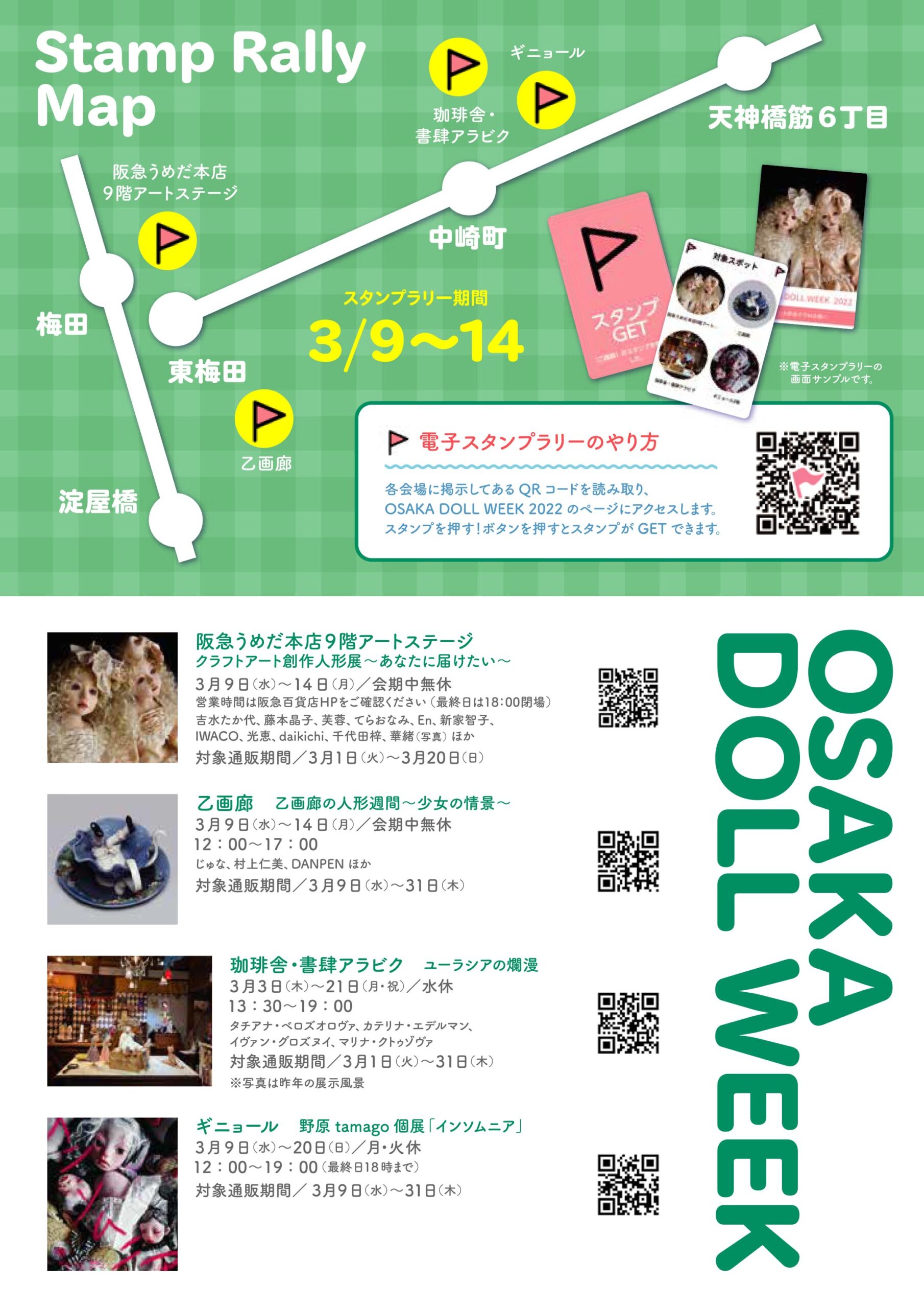 | 2024年8月7日~13日 | SUMMER DOLL FES ’24~HELLO!遊園地~(乙画廊・ギニョール・珈琲舎書肆アラビク・ミホキカクとの共催) | 大阪・阪神梅田本店 8階 ハローカルチャー3 | ![]() | 前年で人形ウイークを終了したので、それに代わるイベントを企画。関西で人形を取り扱う5つのディーラーが集まって遊園地をテーマに創作人形のフェスを開催した。 |