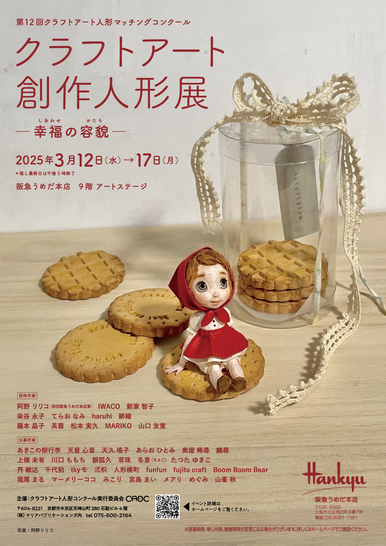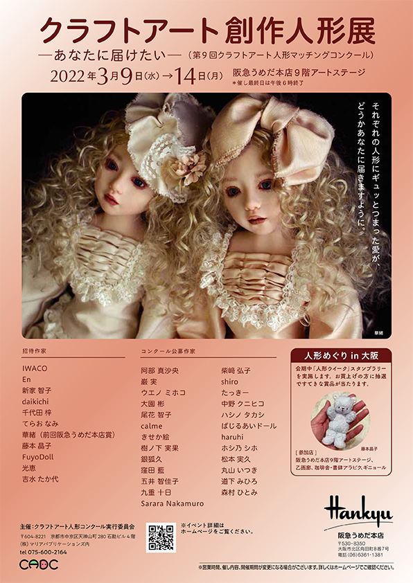 | 2022年3月9日~14日 | クラフトアート創作人形展(第9回クラフトアート人形コンクール)~あなたに届けたい~【大阪展】 | 大阪・阪急うめだ本店 9階アートステージ | ![]() | |