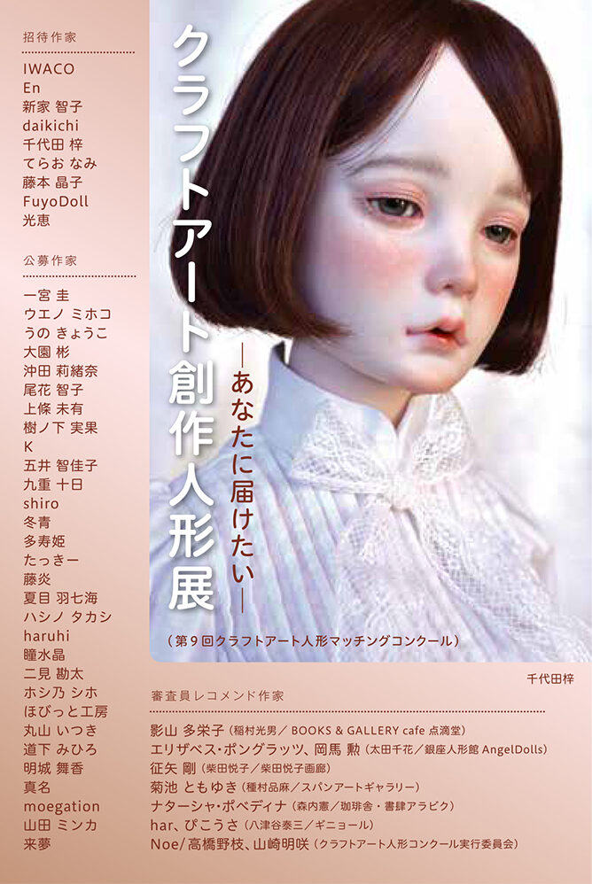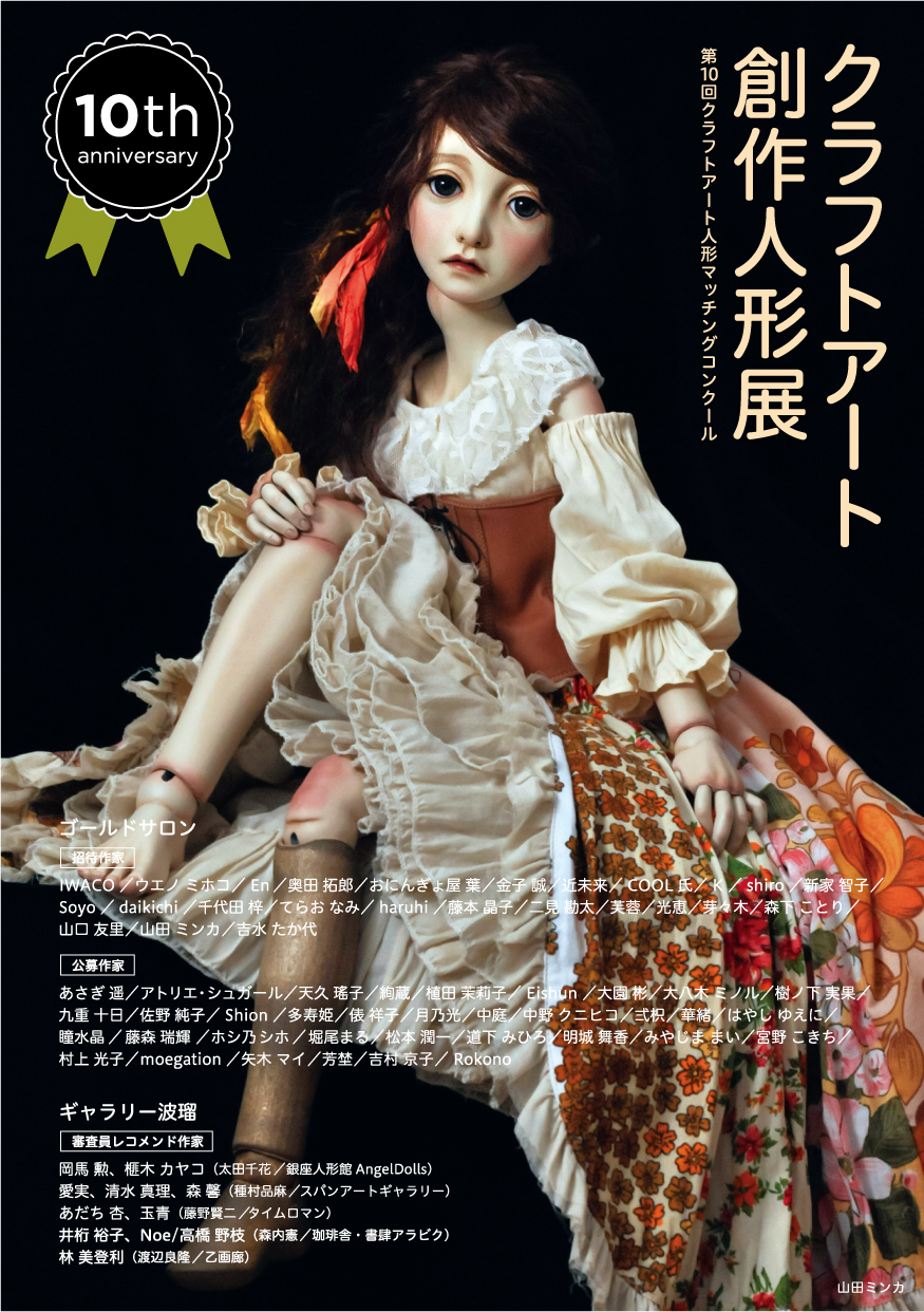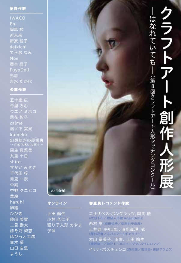 | 2023年2月5日~11日 | クラフトアート創作人形展(第10回クラフトアート人形マッチングコンクール)~10th anniversary~【東京展】 | 東京・東京交通会館 地下1階ゴールドサロン・ギャラリー波瑠 | ![]() | クラフトアート人形コンクール10周年を記念して、過去の歴代受賞者や、審査員によるレコメンド作家など東京大阪あわせて総勢100名を超える人形作家が出展する大規模展を開催。大阪では阪急に加えて阪神でも同時開催し、翌年以降も継続。 |