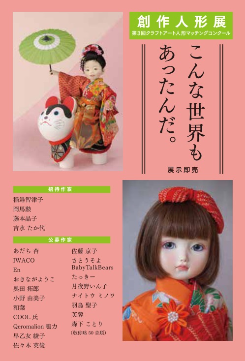 | 2014年1月16日~21日 | 第3回創作人形50人展(第1回クラフトアート人形コンクール) | 大阪・大丸心斎橋店 南館8階 美術画廊 | ![]() | 公募展形式で開催した第1回。審査員はすべて人形ディーラーの、マッチングを目的としたジャンルを問わないコンクールで、現在も継続して開催している。 |