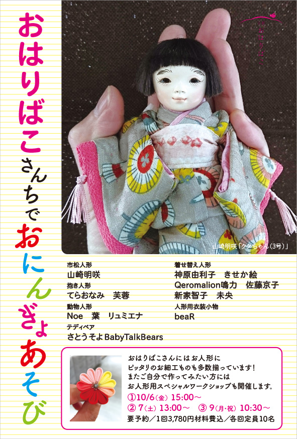 | 2017年10月5日~9日 | おはりばこさんちでおにんぎょあそび | 京都・おはりばこ 離れ | ![]() | 京都のお座敷で「さわって遊べる」人形展をスタート。実際に人形を手に取って遊ぶ楽しさを味わえる企画。 |
